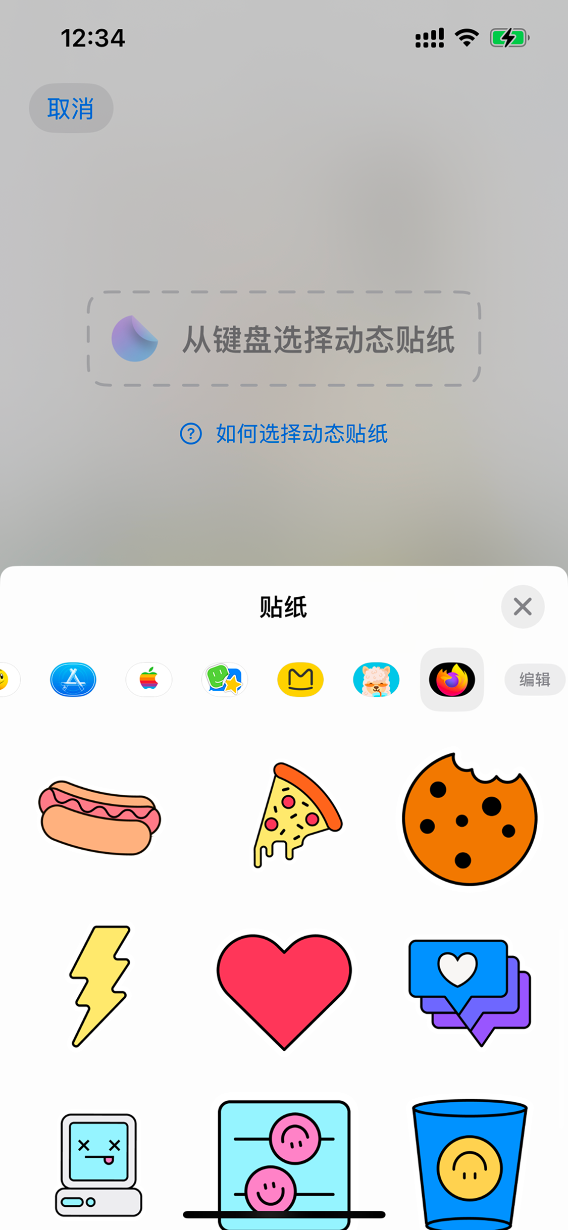 在弹出的贴纸面板选择不同 App 提供的贴纸内容。