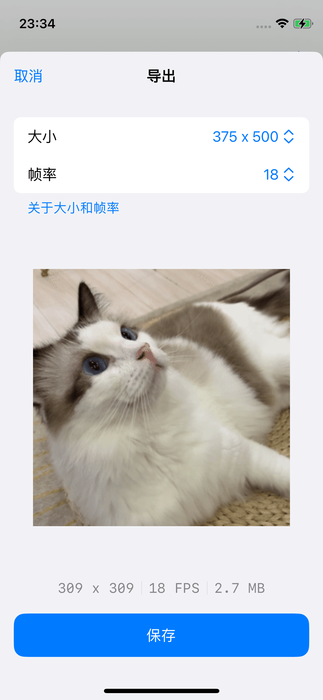 您可在导出页面预览最终的 GIF 效果,并可调节大小和帧率来设置 GIF 的图片尺寸以及播放的流畅度。具体可参见:关于大小和帧率。