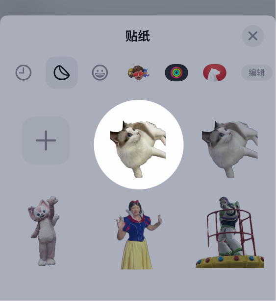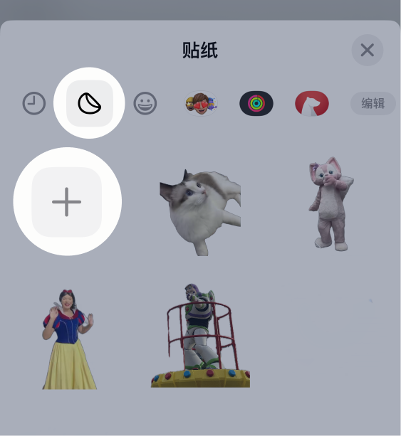 在新的界面中选择「贴纸」图标,随后点击第一个位置的加号按钮。
