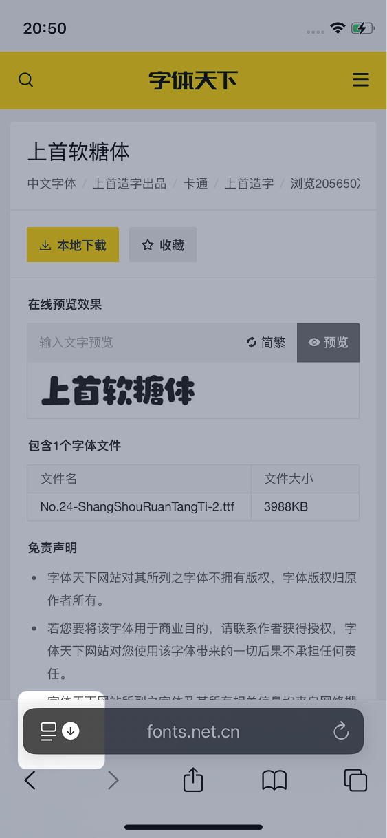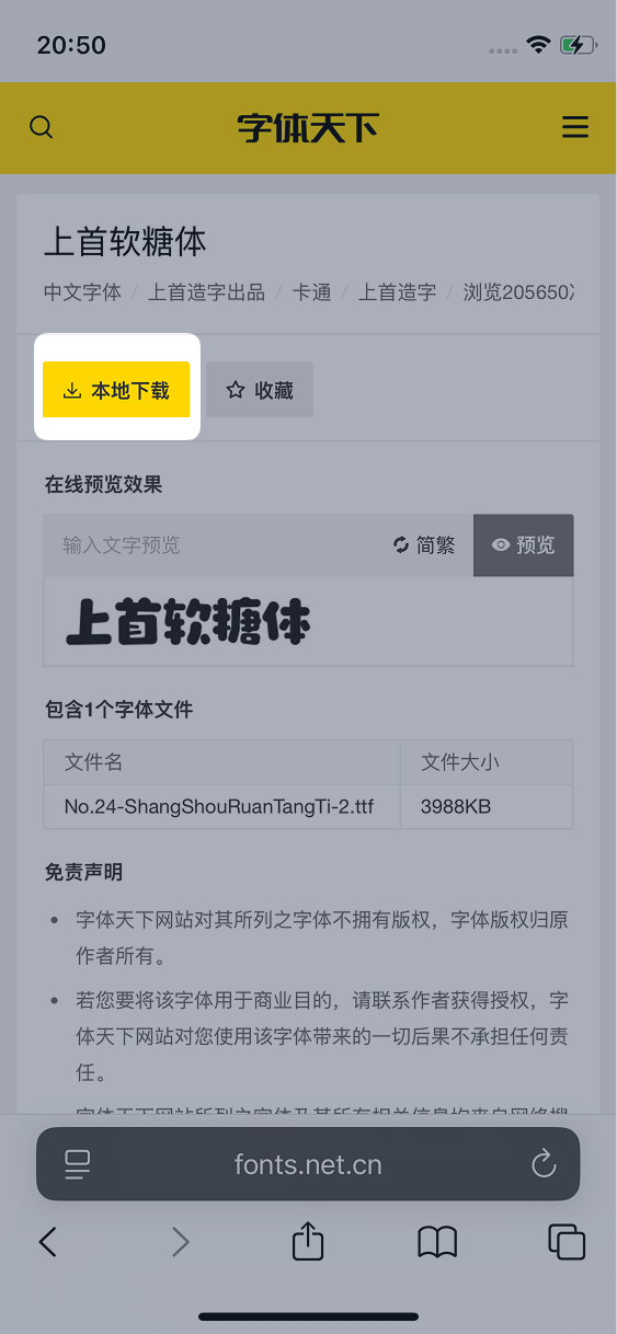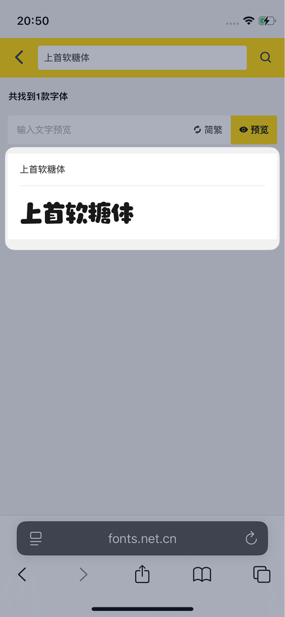 在搜索框中输入想要下载的字体名称,例如「上首软糖体」,然后点击搜索,然后点击搜索结果进入详情页: