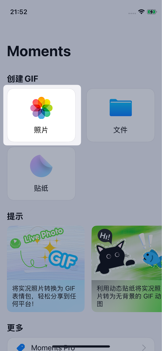 打开 Moments,在首页选择照片: