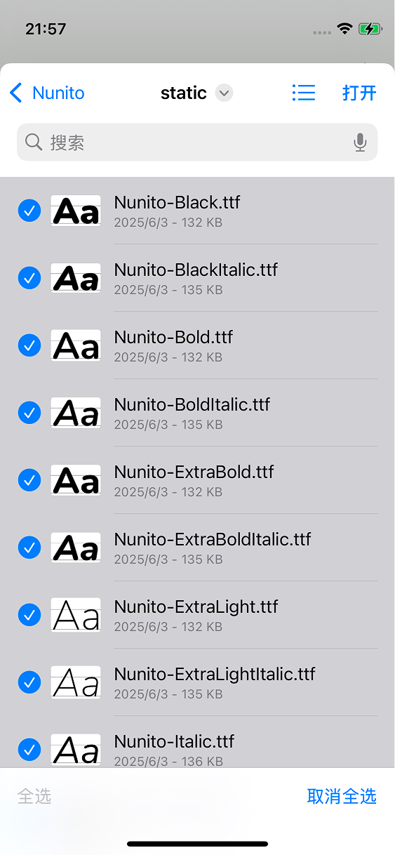 您可以一次性导入多个字体文件,选中所有要导入的字体文件后点击打开即可:
