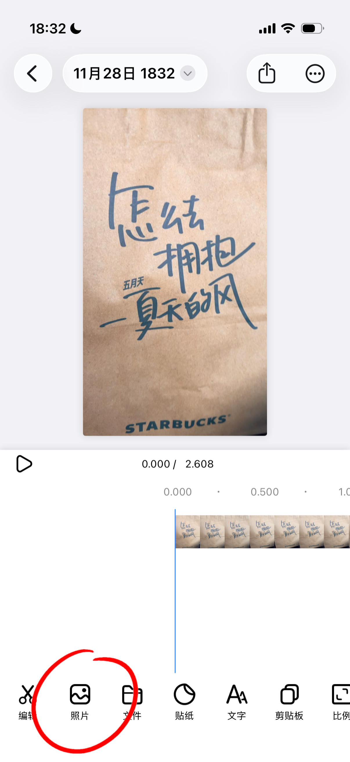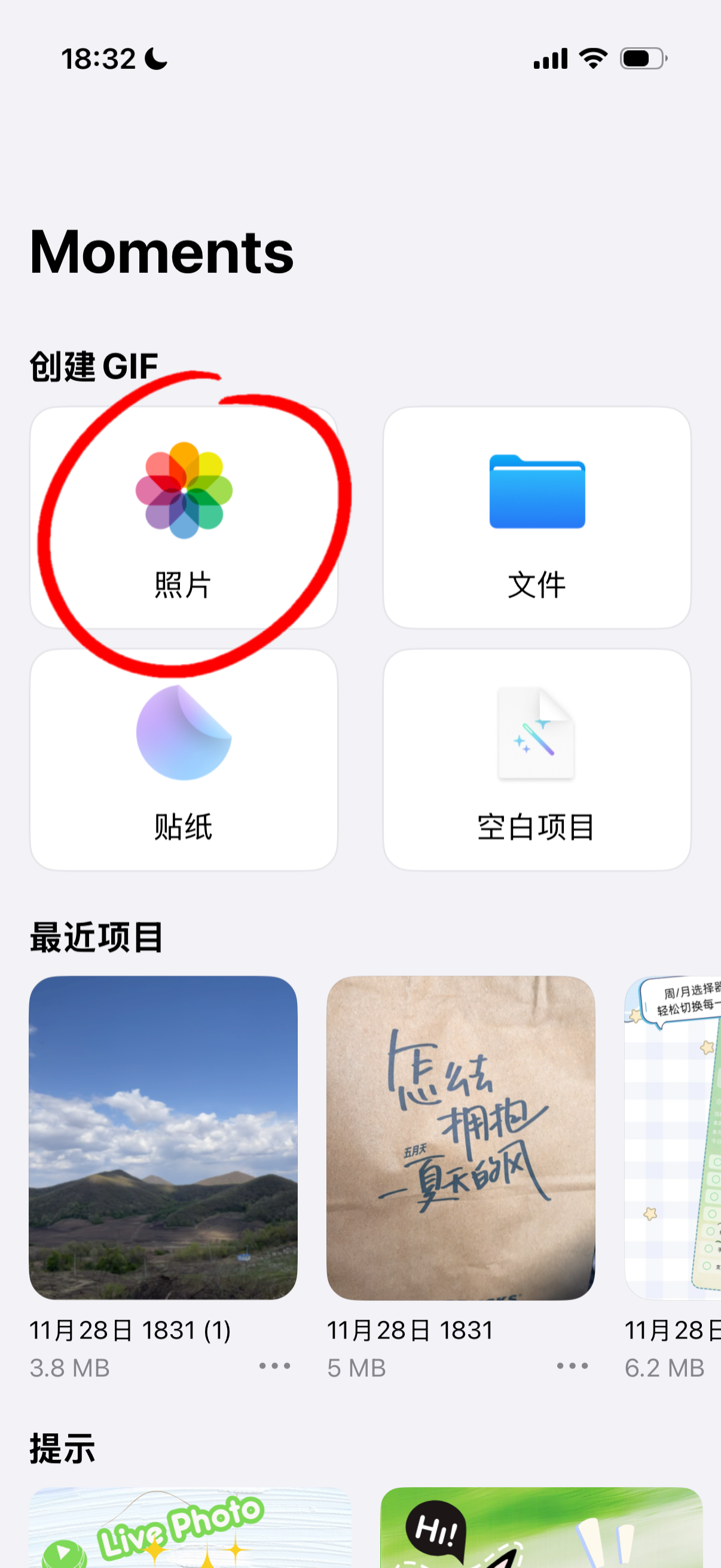 点击 Moments 首页的照片按钮,选择一张实况照片进入编辑器。
