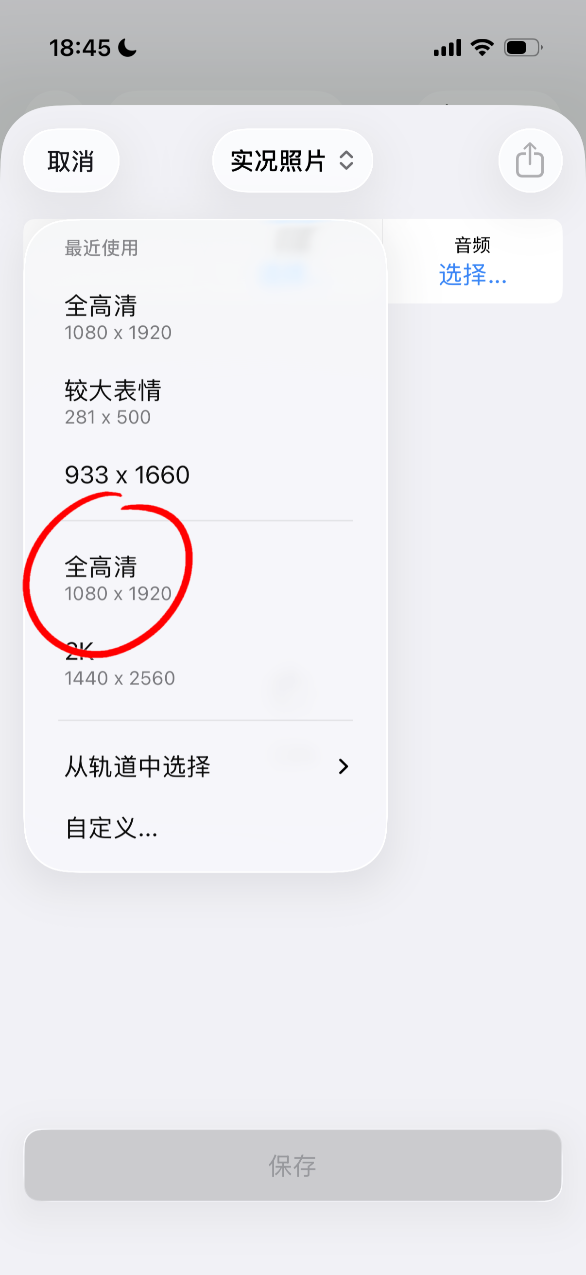 最后,点击导出按钮,在导出页面点击顶部的 GIF 按钮,并在弹出的菜单中选择实况照片。点击大小按钮,选择「全高清」,等待加载完成即可预览拼接好的实况照片。