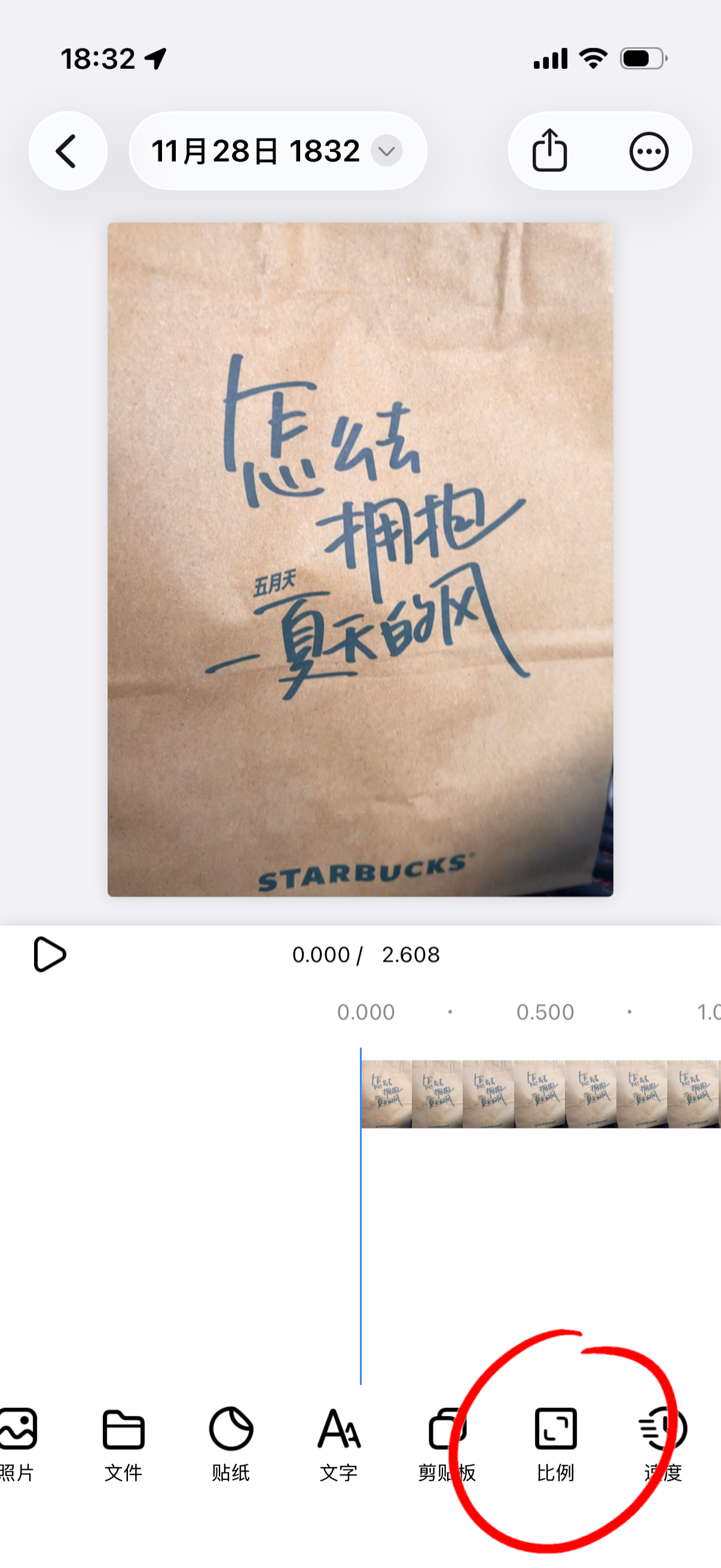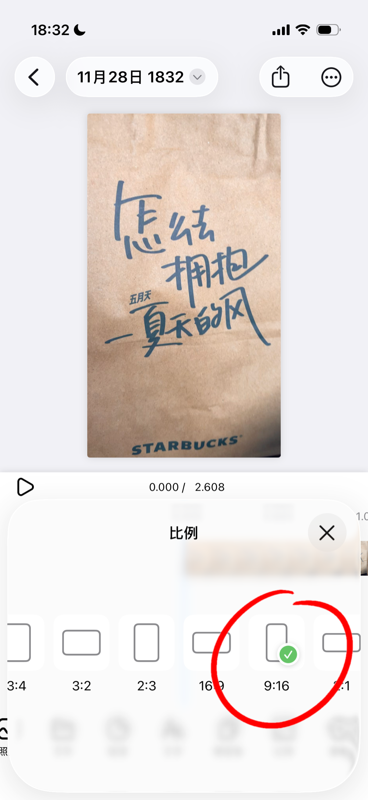 滑动底部操作栏,点击比例按钮,选择一个想要拼图的比例,这里选择 9:16 纵向比例。